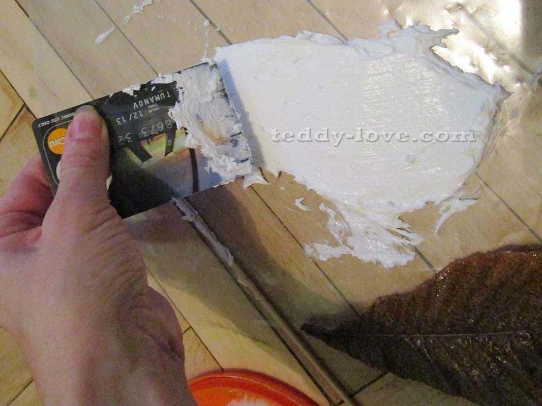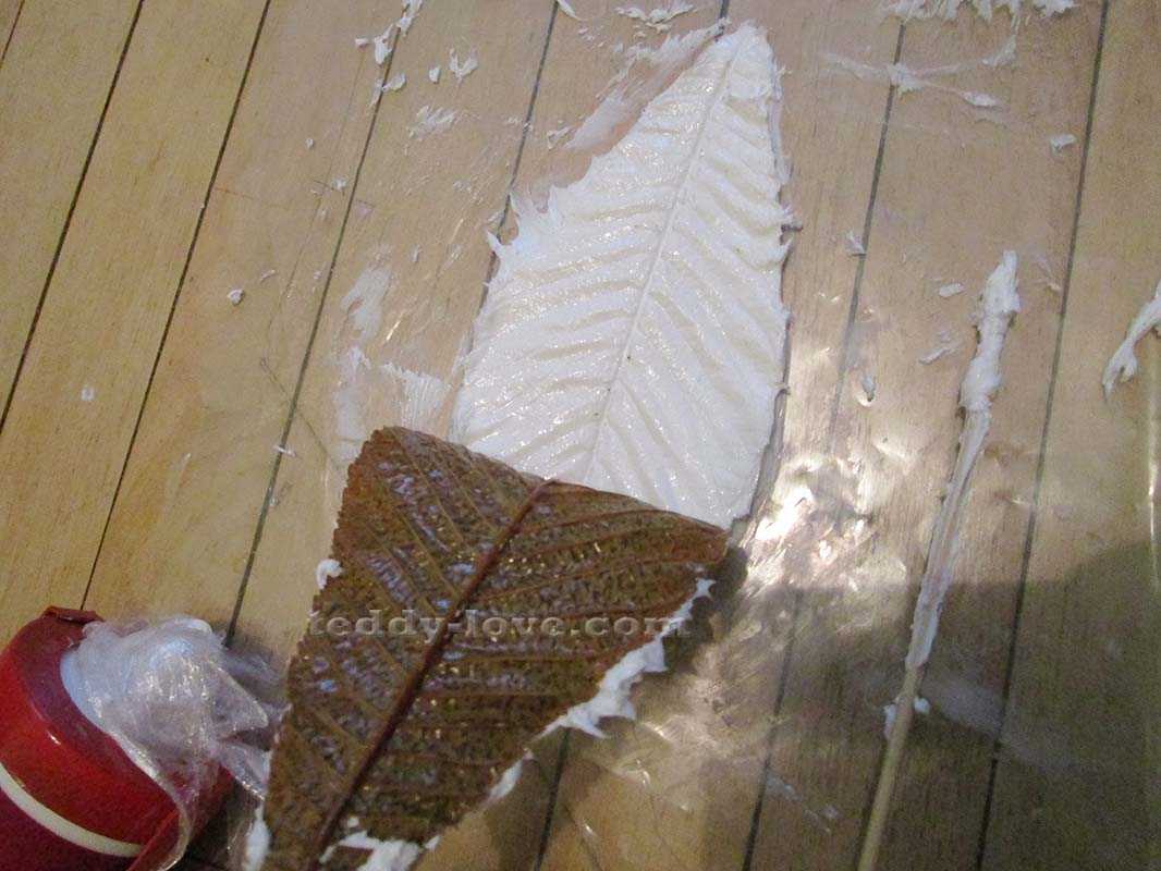 Итак, Как сделать форму из силиконового герметика своими руками!Выдавила пасту, примерно по размеру листика разровняла. Пригодилась старая кредитка.