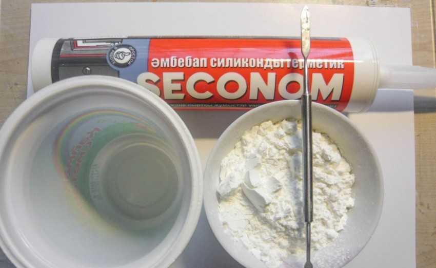 Все материалы нужно приготовить заранее, так как герметик очень быстро начинает засыхать. Перчаток лучше взять 2 пары, потому что они могут порваться, а замешивать на первом этапе голыми руками не рекомендуется. В качестве контейнера лучше использовать ёмкость, которую в дальнейшем можно будет выкинуть. Также можно обойтись и без неё, делая все это на подготовленной поверхности (пластиковая или деревянная доска).