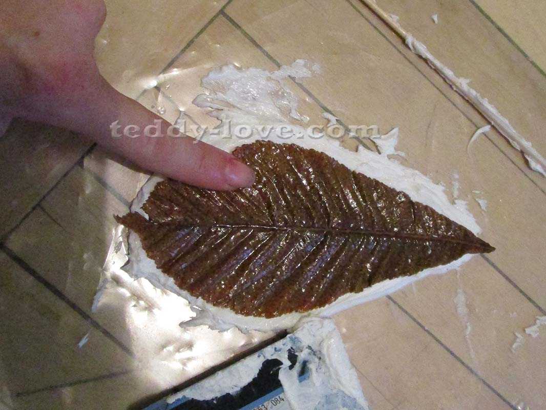 Смазала листик подсолнечным маслом. Думаю, что его после улицы надо помыть, все и так догадались Приложила к герметику, хорошо прогладила пальцем, чтобы отпечатался рисунок листа. Лишний герметик легко собирается той же карточкой.