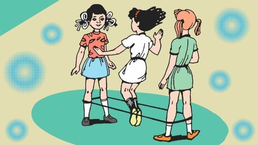 - Двум девочкам зафиксировать резинку на своих щиколотках и отойти друг от другу на расстояние, чтобы резинка между ними натянулась и не провисала.