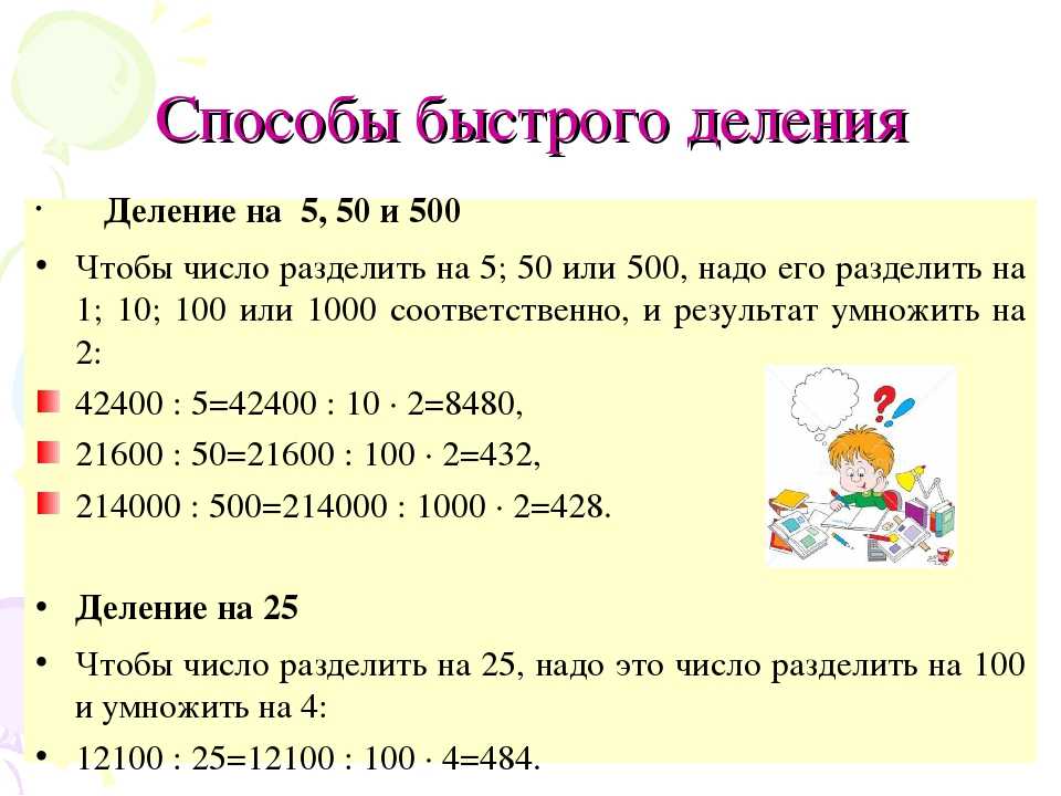 Еще проще правило деления на 5. Сначала умножаем на 2, а затем полученное делим на 10.