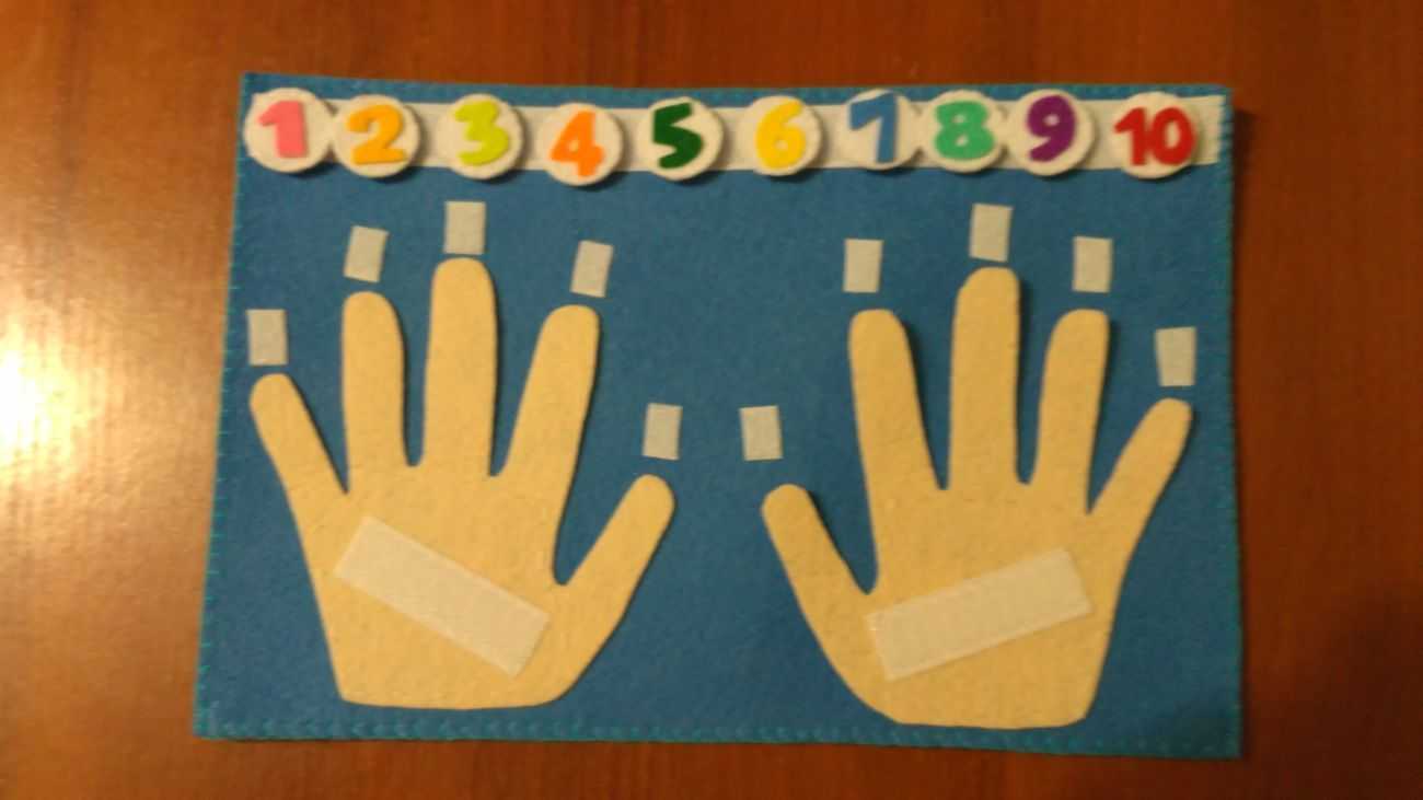 Облегчить переход к другим методикам поможет специальное пособие, которое легко изготовить своими руками. Для этого понадобится 2 куска вспененной резины или ткани разного цвета, 22 липучки, лист картона. Из резины нужно вырезать две ладошки. На кончики пальцев с двух сторон и по их центру разместить по липучке. Это позволит загибать пальцы в нужном количестве, создавая различные комбинации.