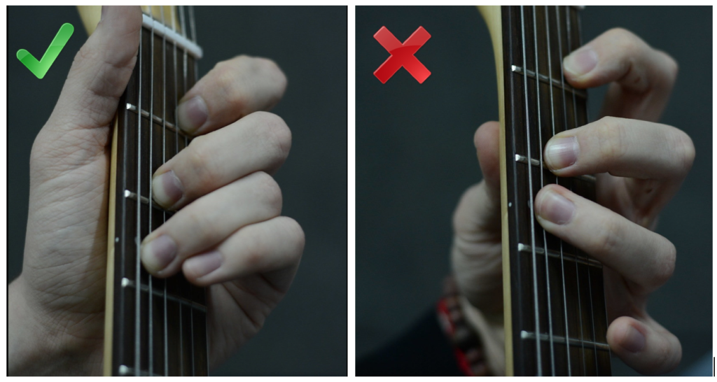 Большой палец — опора для грифа. В идеале, он не должен выступать вообще, чтобы большая часть ладони покрывала струны.