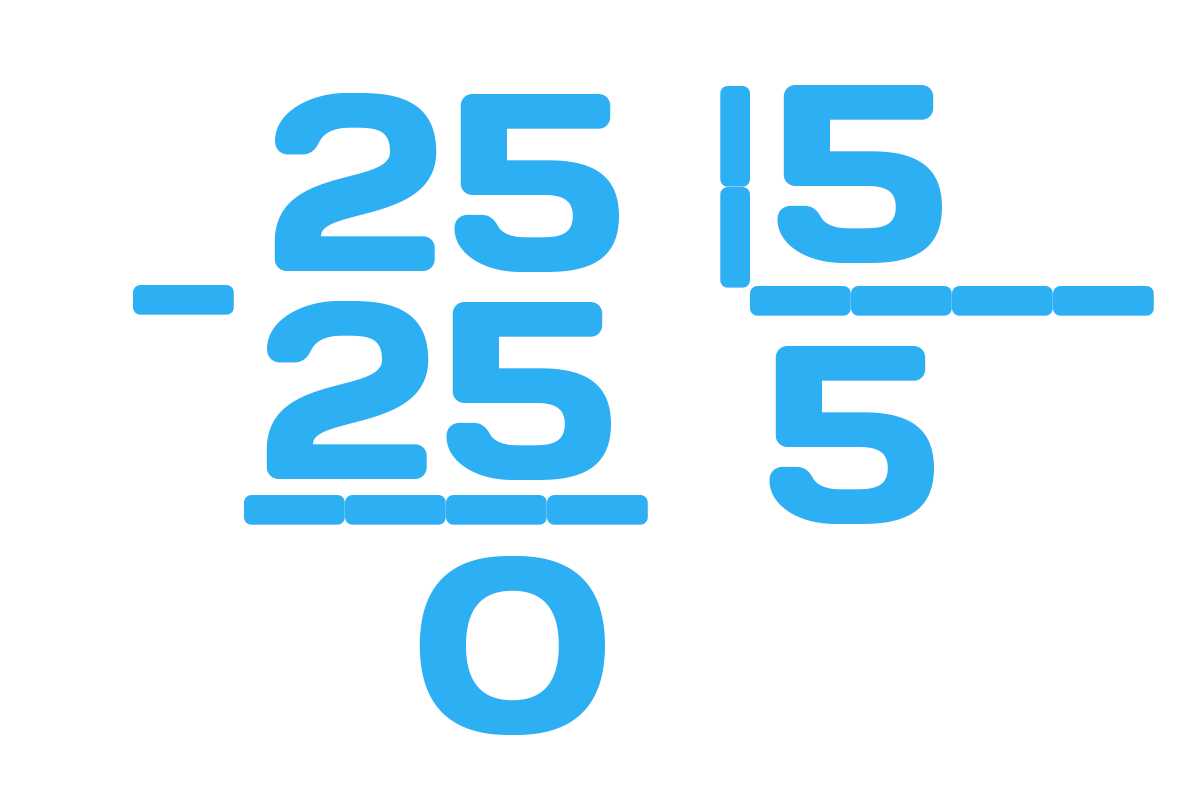 Шаг 4. После вычитания полученную цифру (в примере 2) необходимо записать и к ней добавить цифру из делимого, получаем 25, с этим числом необходимо повторить расчёт: