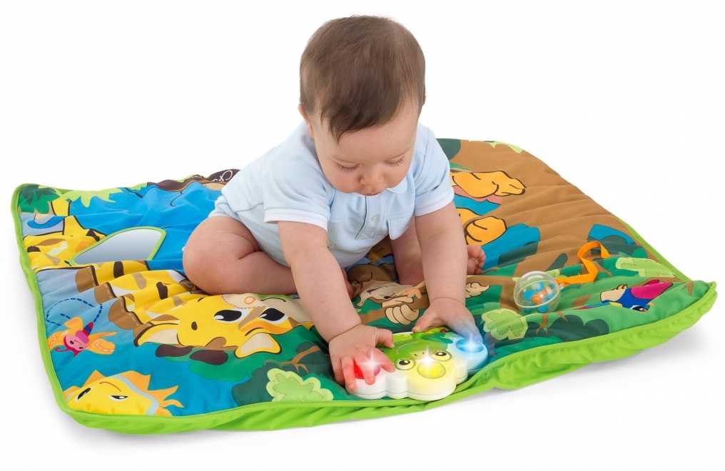 Наполнение. На коврике для 5-месячного малыша уже не обязательно должны быть дуги для крепления игрушек. В этом возрасте ребенок проводит много времени на животе и может уже сидеть с поддержкой. Для таких больших карапузов разумно отдавать предпочтение моделям с интересным игровым полем. Например, музыкальные кнопки, которые будут включаться при каждом ударе по ним.