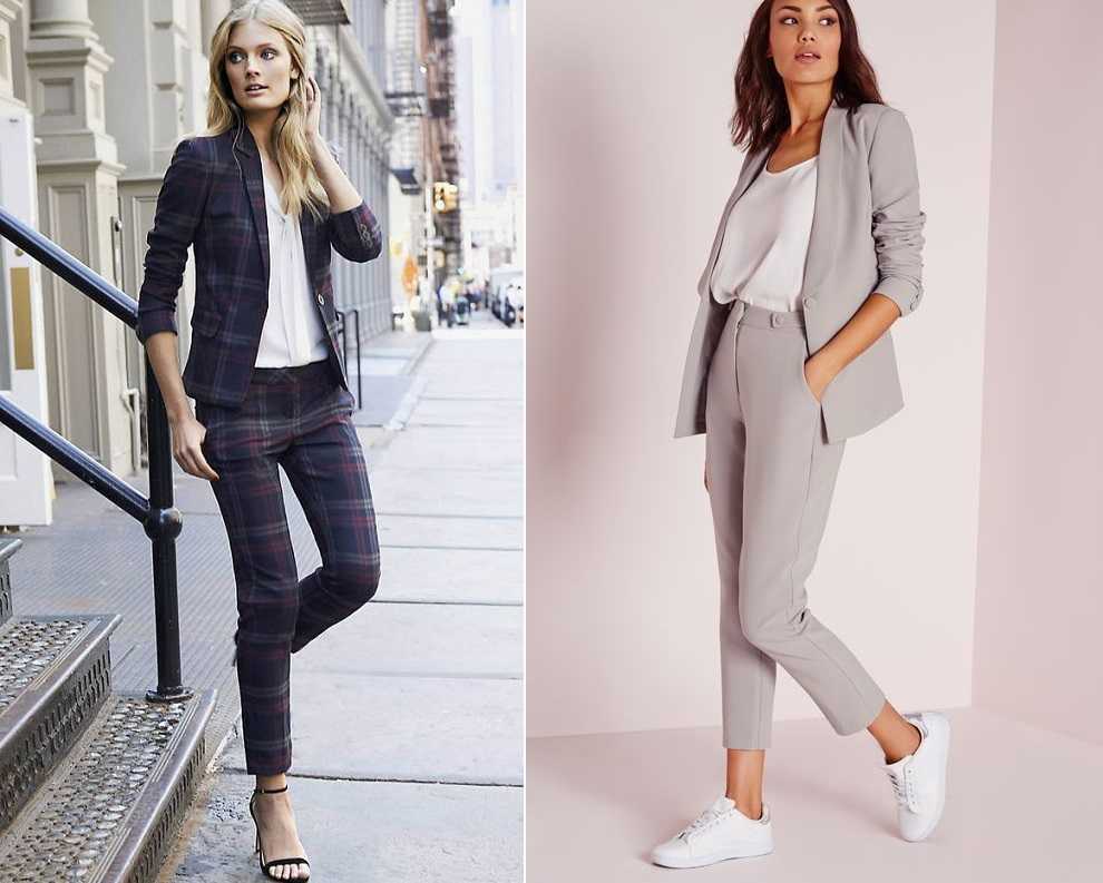 - стильный костюм кэжуал или модель в яркой расцветке дополнят лоферы или монки.