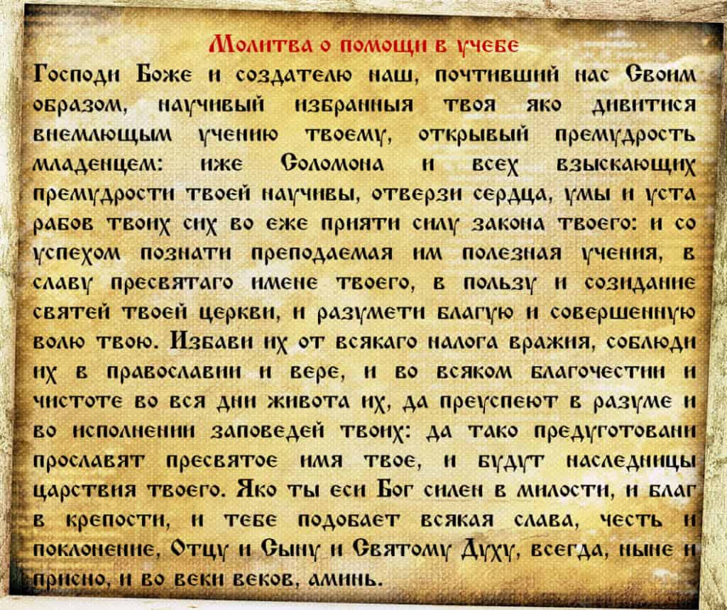 Милосердный Господи Иисусе Христе, Тебе вручаю чад наших, дарованных нам Тобою, исполни наши моления. Прошу Тебя, Господи, спаси их путями, которые Ты Сам веси. Сохрани их от пороков, зла и гордости, и да не коснется души их ничто, противное Тебе. Но веру, любовь и надежду на спасение даруй им, и да будут они Тебе избранными сосудами Духа Святого, и да будет свят и непорочен пред Богом жизненный их путь.