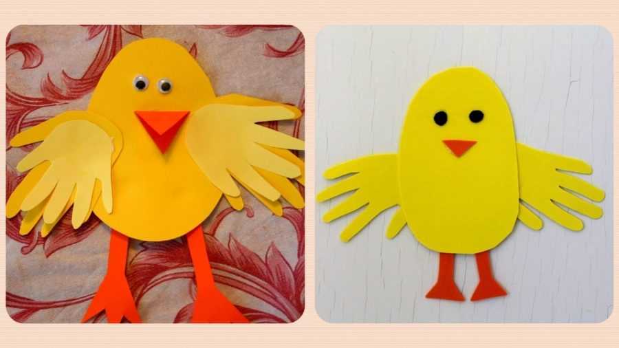 В основном все поделки из детских ладошек делают из цветной бумаги. Это простое и увлекательное занятие привлекает детей. Особенно, если они занимаются творчеством вместе со взрослыми. Например, можно сконструировать очаровательного цыпленка. Для его создания потребуется немного усилий: