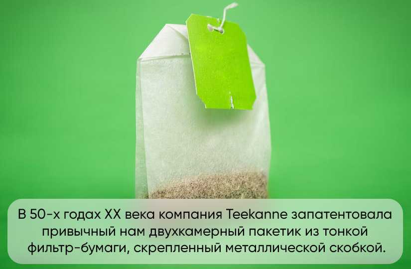 Уже в 50-х годах ХХ века компания Teekanne запатентовала привычный нам двухкамерный пакетик из тонкой фильтр-бумаги, скрепленный металлической скобкой. С тех пор он обрел мировую известность и остается одним из наиболее распространенных вариантов чайных пакетиков.